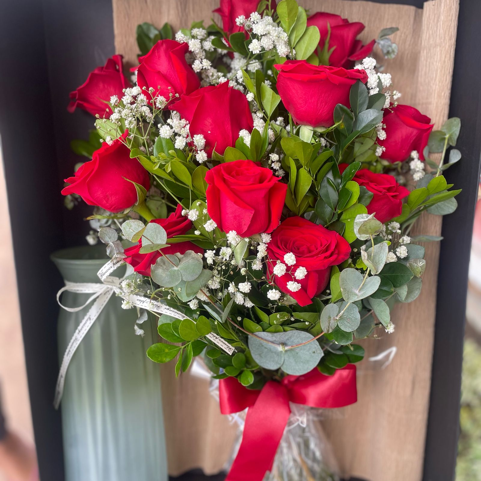 Caixa cartonada com visor, com um ramalhete de 12 rosas e um vaso de vidro