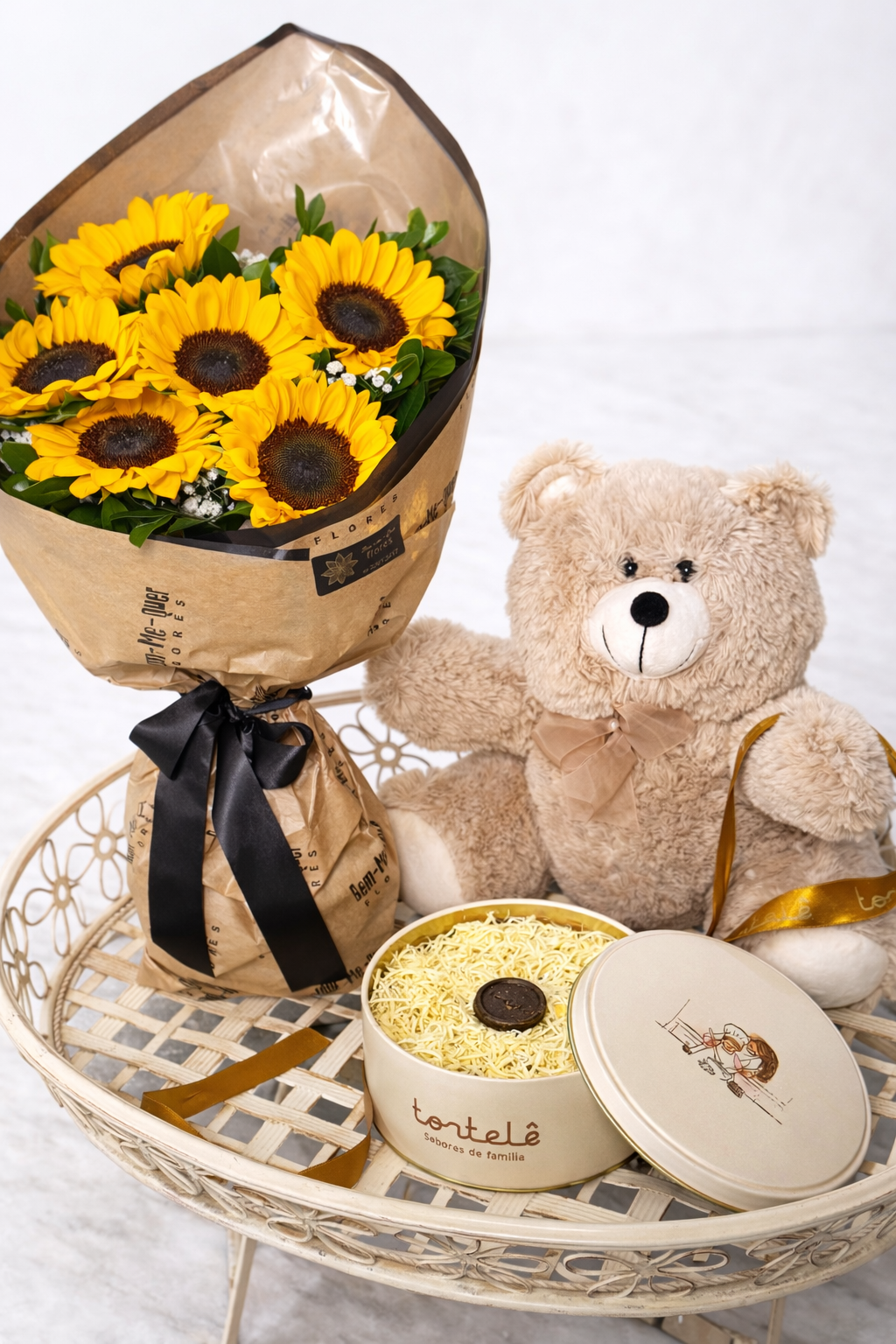 Uma linda kit para alegrar o dia de alguém especial.COMPOSIÇÃO1 Ramalhete com 6 girassóis1 Pelúcia urso dengo 28cm1 Torta tortelê Lata bege com creme de Ouro Branco